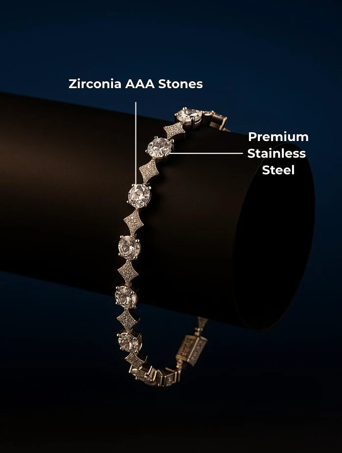Each piece is crafted from high-grade stainless steel and finished with precision 18K gold plating or hand-set zirconia stones. The result is jewelry that resists tarnish, maintains its brilliance, and delivers a refined, diamond-like shine that lasts.